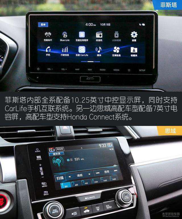 当今年轻消费者对于车机功要求不亚于对外观设计的要求,在这部分里,LA FESTA菲斯塔全系车型搭载10.25英寸中控屏,同时全系车型支持百度CarLife系统,另外高配两款车型标配第二代智能网联系统(除入门车型,其余两款车型支持选配。),这套系统能通过语音控制车内一些基本功能。另一边思域的车机就相对没那没多功能,高配车型搭载7英寸显示屏,其中高配车型搭载Honda Connect系统,不过多媒体系统的玩法要比LA FESTA菲斯塔落后不少。