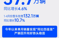 [本站 资讯] 日前,上汽集团发布销量快报,4月整车批售37.7万辆,同比增长4.6%。1-4月份整车批售13…