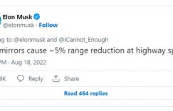 [本站 资讯]日前,马斯克在社交媒体上表示,电动汽车上的外后视镜,会让电动汽车最多减少约5%的续航。…