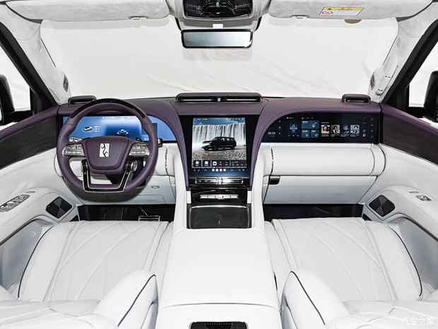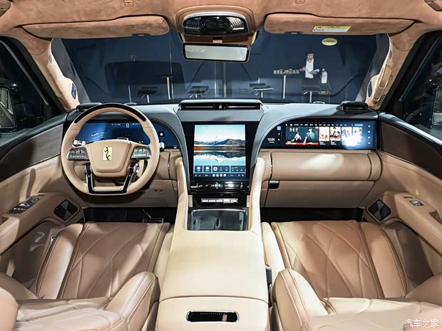 内饰发布了紫灰以及黑棕两款内饰配色,中控区域与仰望U8保持一致,配备23.6英寸液晶仪表屏+12.8英寸中控屏+23.6英寸副驾娱乐屏。官方介绍,方向盘中心的车标也可选配24K黄金logo。车内应用了大量的实木材料,有着不错的质感。