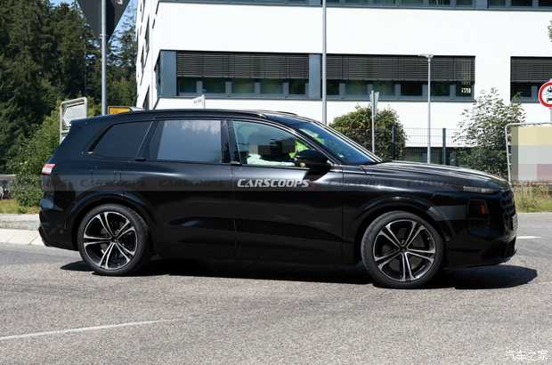 车侧多线条的勾勒让整车看上去更加立体,柔和的曲线与锐利的折痕相得益彰。车窗面积有望增加,更显眼的D柱也加入其中。配备22英寸轮圈和隐藏式门把手。车身长度预计比现款更长,作为对比,现款车身长宽高分别为5077(5066)/1970/1701mm,轴距3002mm。