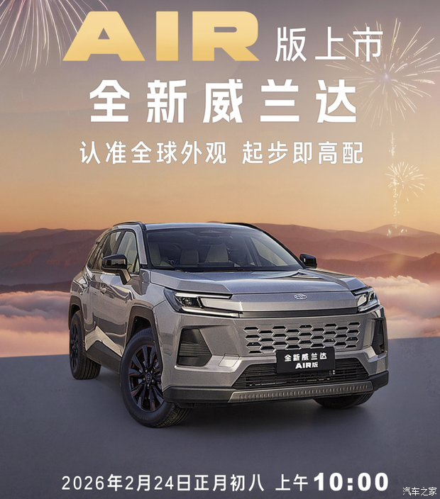 [本站 资讯] 广汽丰田全新威兰达AIR版将于2月24日上市,官方表示此次将针对入门的AIR版升级配置,起步即高配,提升产品竞争力。作为了解,全新威兰达定位为一款紧凑型SUV,采用燃油和油电混动动力,在2025年广州车展上市,共推9款车型,售价16.98-23.08万元,超配换购价15.98-22.08万元。