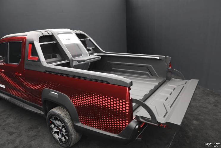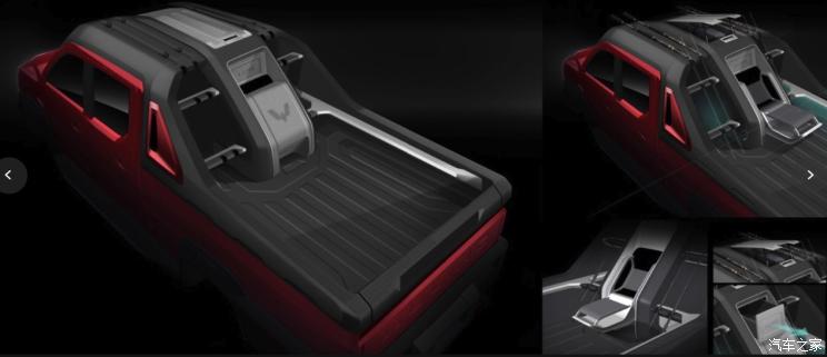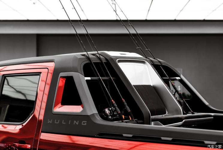 车身侧面,该车配备渐变式马赛克车身拉花,提升车辆辨识度。同时,新车配备了一体化可拆卸龙门架,并在内部配备卡槽,方便收纳鱼竿。当然,龙门架上有了鱼竿卡槽,那货箱内部也少不了两侧带鱼竿卡槽的可折叠座椅,提升车辆的使用场景以及便利性。值得一提的是,该车还提供了车载小冰箱,可存放生鲜等物品。轮胎方面,新车将配备规格为235/45 R17的越野轮胎。