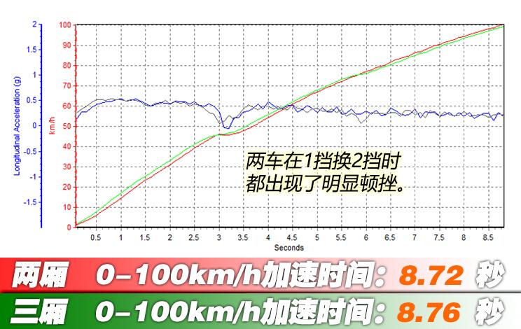 同时,资料显示两厢车型比三厢车型轻了约75kg,差不多是一个成年男性的体重,但两车加速成绩几乎相同。电子系统对变速箱真是百般呵护,两车均不支持弹射起步。如果非要尝试,转速也只会轻微上扬,放开刹车后车子立即用一个极其缓慢并长达数秒的蠕行回应你。因此,我们只能用全油门的方式起步。油门到底后需要等转速,所以起步的前半秒比较柔和,转速超过2000rpm以上时开始爆发,前轮会轻微打滑。紧接着1挡升2挡时两车都会有一个明显的,就像突然丢掉油门再加油一样的动力中断,并且无论电子稳定系统用哪种模式、变速箱手动还是自动换挡都是一样的结果,损失了不少时间。所以两车在0℃左右的气温下取得8.7秒的加速时间比我们预计的要慢。