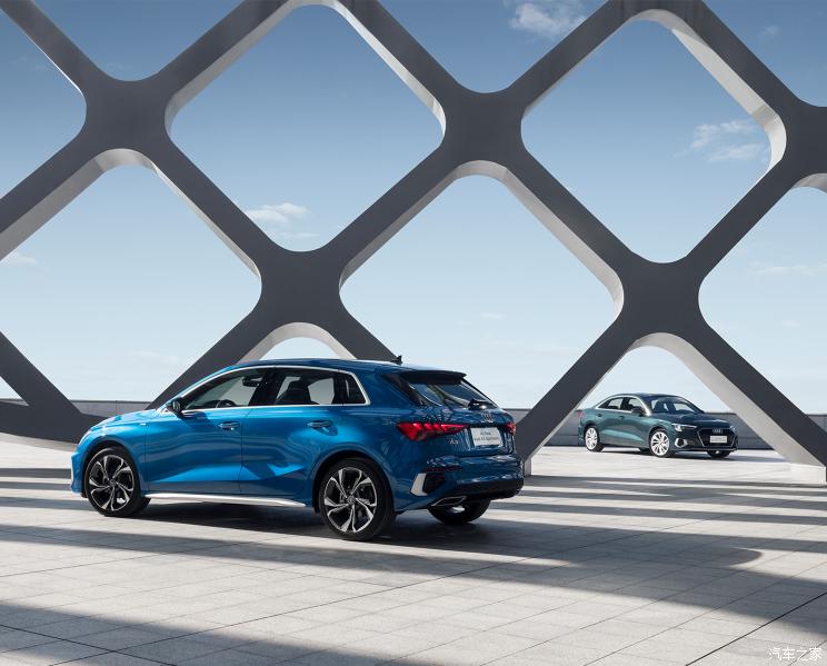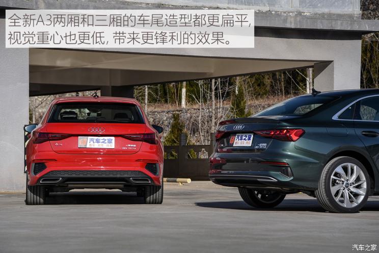车尾部分,两厢版与三厢版也都采用了相同的设计元素,例如尾灯造型与熏黑式设计、后包围设计,以及双边共两出的排气布局等。而最不一样的除了突出的尾部造型外,左下角的“A3/A3L”成了分辨车型的身份标识。