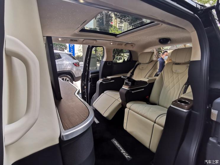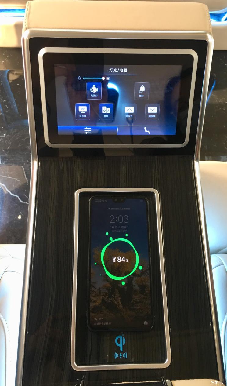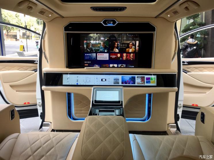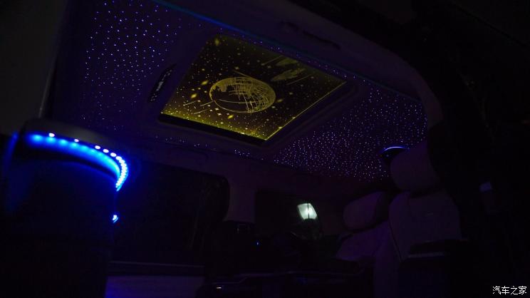 二排方面,驾驶座椅后方由一台大尺寸显示器进行空间上的隔断,提升后排私密性。同时,该车在后排座椅处也配备了T型控制台,有多块屏幕组成,能够实时的了解车辆信息的同时,还能够进行娱乐上面的操控,提升乘坐感受。此外,该车还配备了当下十分流行的星空顶配置。