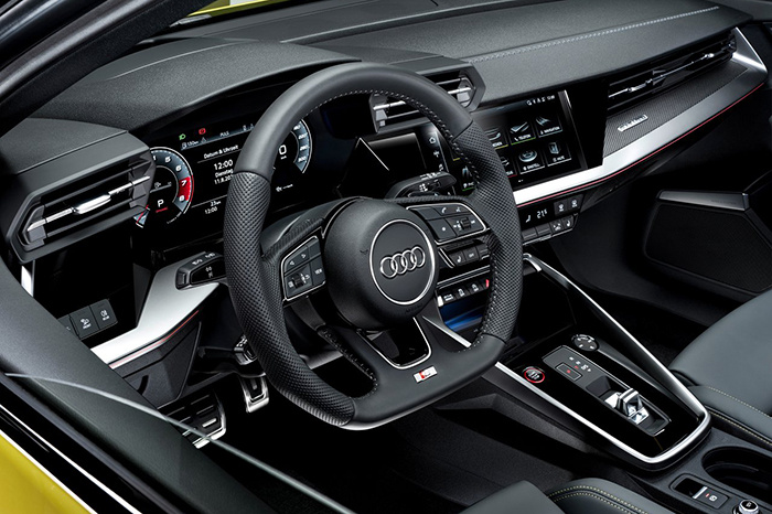 来到车厢内部,与奥迪一贯的传统相一致,S3与普通A3的内饰整体风格是完全一样的;只有在细节标识以及用料上会更加突出整车的运动分为。比如,奥迪S3内饰采用了与“S”同底色的红色、方向盘由圆底更换为了平底设计、座椅样式较此前更加运动、仪表面板换装为了碳纤维材料,所有的小心思结合起来,就能够让车厢内的氛围明显往性能上靠拢。