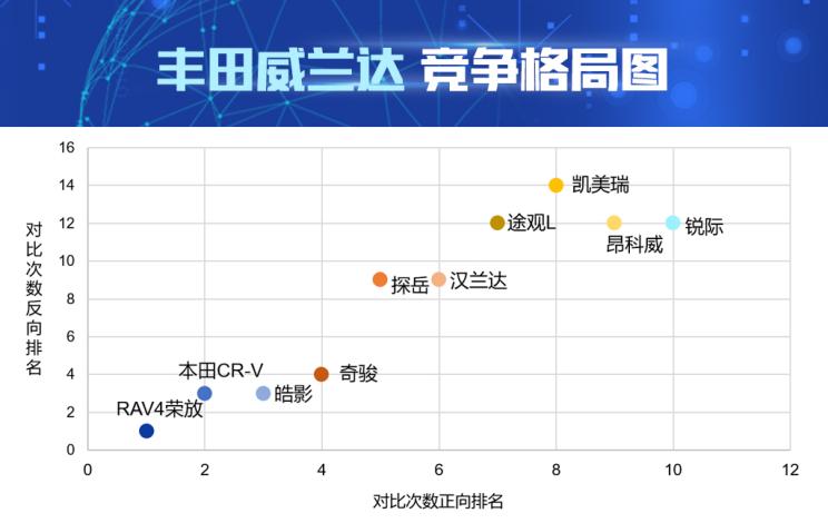 本站大数据中不同车系间的相互对比次数能够很好反映用户心目中车系的竞争关系。根据本站上的车型对比数据,与威兰达进行对比的车系中,对比次数位列Top 3的竞品分别为RAV4荣放、本田CR-V、皓影,我们将其视作威兰达的核心竞品。可以看出,对威兰达来说,兄弟车型RAV4荣放对其用户的争夺最为激烈。