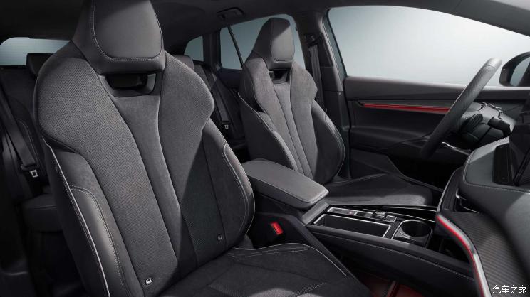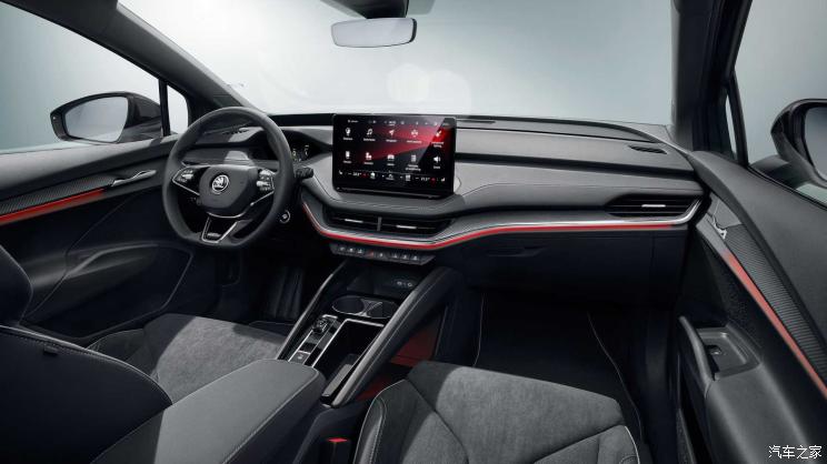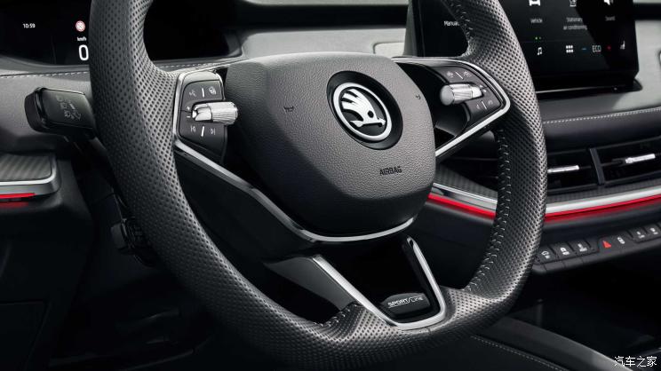 内饰部分,ENYAQ Sportline iV的座椅、仪表台均以黑色为主色调,并装饰有灰色的滚边。仪表板采用黑色合成革装饰,搭配有碳纤维装饰来提升车内的运动氛围。Suedia超细纤维包裹的前排一体式运动座椅、带有Sportline徽章的三辐式平底方向盘,也是Sportline的专属配置。