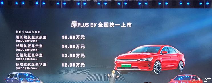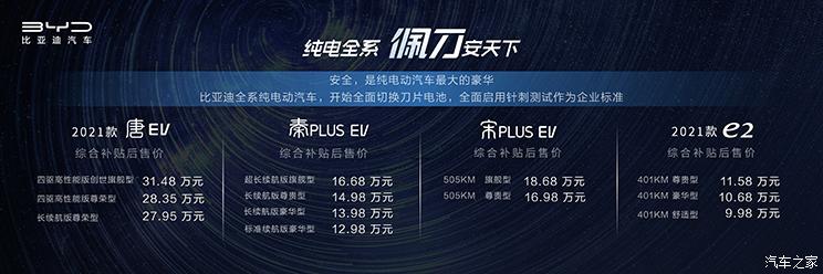 [本站 新车上市] 4月7日,比亚迪举办新车上市发布会,秦PLUS EV、宋PLUS EV、e2几款新车迎来上市,综合补贴后售价区间为9.98-18.68万元,详细价格请见下表。此外,比亚迪还宣布即日起,旗下所有车型将搭载磷酸铁锂刀片电池。