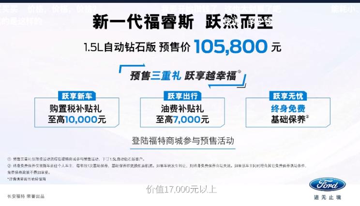 [本站 资讯] 4月12日,长安福特发布了旗下紧凑型车–新款福睿斯自动钻石版的预售价,预售价为10.58万元,新车开启预售,全系车型阵容尚未公布,将于上海车展期间正式亮相。新车是福睿斯中期改款车型,升级后的外观内饰更趋向于年轻化。此外,新车目前正在参与“本站云车展”,感兴趣的网友可以关注。