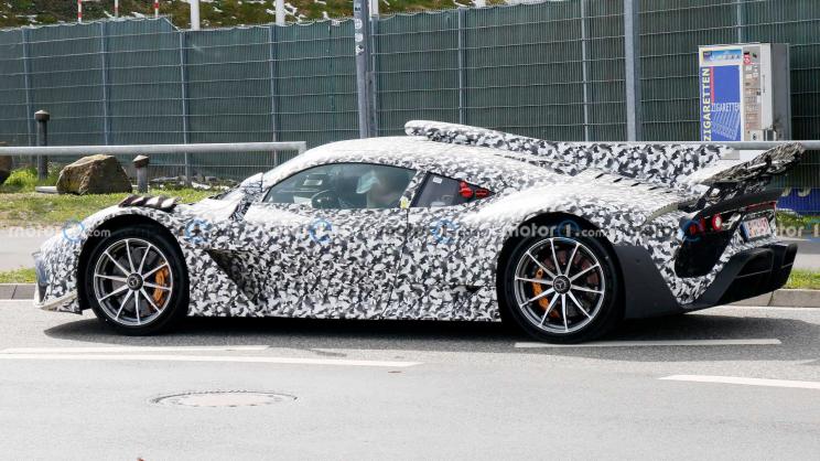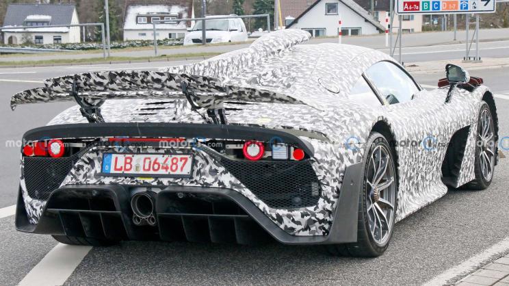 此次拍摄到的谍照中,AMG ONE依旧覆盖着较为厚重的伪装,但从暴露出来的细节,我们能够看到其外观基本延续了概念车的外观,且大部分要素已经非常成熟,仅尾灯部分的灯腔设计并未公开,预计会在之前版本的基础上做小改动。而根据前轮拱上方的鲨鱼鳍状导流槽与尾翼完全打开推测,此次的路试可能测试了包括运动模式在内的不同驾驶模式。