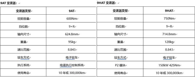 变速箱方面,这款自主研发的9速自动变速箱最大可以承受600牛・米的扭矩,整体重量仅有95公斤;而它还可以兼容P2混动系统,其原理是在9速变速箱上增加了P2混动电机和用于变速器与发动机动力耦合的C0离合器结构,可以实现整车自由的切换纯电或混合驱动模式。这套代号为9HAT的变速箱可以承受750牛・米的扭矩,重量也仅有128公斤。
