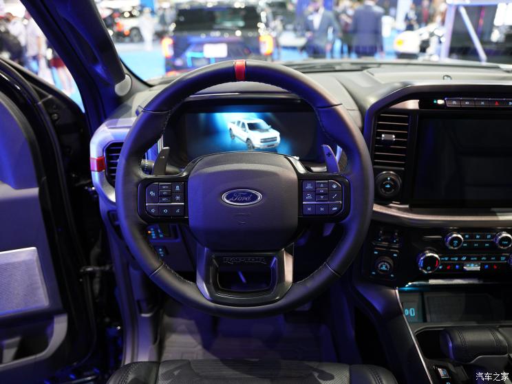 进入内饰,简洁而粗犷的中控台设计依旧十分有特点,而车内的红色缝线和座椅上的“Raptor”印花也表明了它高性能的身份。此外新车还搭载了12英寸竖式中控屏幕,并内置SYNC 4车机系统,可支持Apple CarPlay、Android Auto蓝牙、导航和车载Wi-Fi等功能。