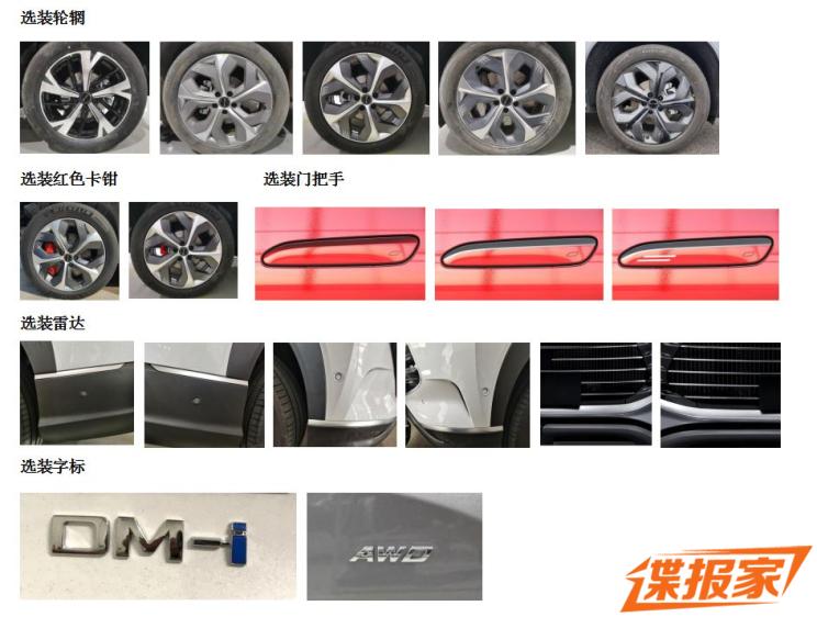 配置方面,新车提供不同样式的轮圈、红色卡钳等供消费者选择。根据此前信息,新车还将配备一体式电动调节座椅、15.6英寸DiLink系统中控屏、12扬声器、5G网络等配置。动力方面,新车搭载DM-i插混系统,1.5T发动机的最大功率为102kW,前/后电机峰值功率为145kW/150kW,配磷酸铁锂蓄电池。