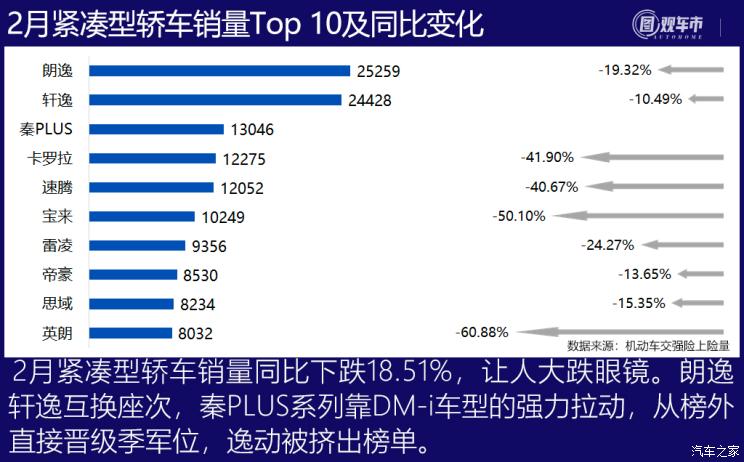 中国品牌靠新能源汽车拉动,降幅低于总体车市,日系车有混动支撑,表现也优于大盘。具体到品牌层面,比亚迪、丰田、五菱汽车、特斯拉的增长,显得鹤立鸡群,大众、吉利甚至宝马,都出现了超过20%的跌幅。2月的新能源渗透率超过了20%,插混市场的增速大大高于纯电动市场。2月最大的赢家非比亚迪莫属,在多个细分市场都取得不错的成绩。本期为您奉上2月轿车各细分市场的销量排行变化与解读――