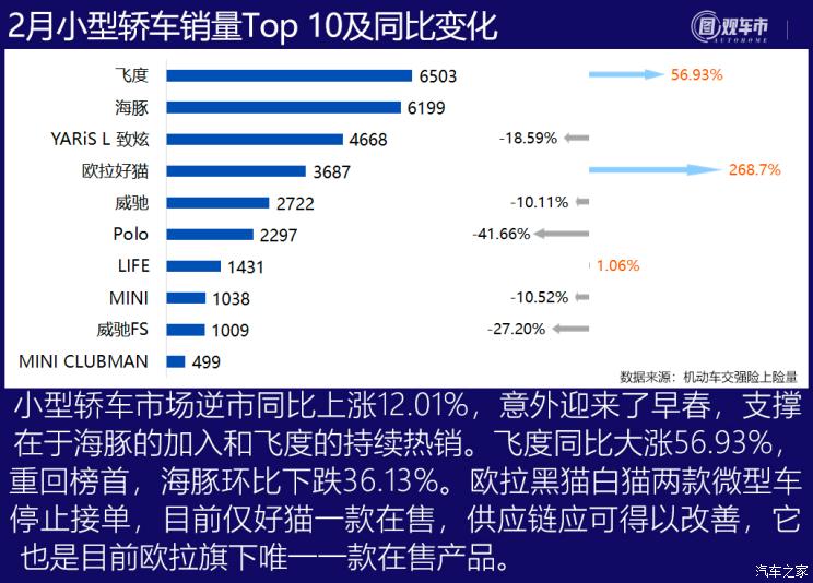 紧凑型轿车2月上险销量28.21万辆,同比下跌18.51%,除比亚迪靠秦PLUS强势拉动实现大幅增长外,大众、日产、丰田、吉利汽车在这一细分市场都非常失意。中型轿车销量12.42万辆,同比降13.02%,丰田和本田完胜,旗下中型车销量分别增长了31.8%和24.36%。中大型轿车销售4.76万辆,同比降6.23%,算是跑赢大市,不过也主要靠极氪和比亚迪在该市场的新车上市拉动。微型车,依然骨骼清奇,6.51万辆的月销量同比大涨了92.38%,这里面,宏光MINIEV占了43%。