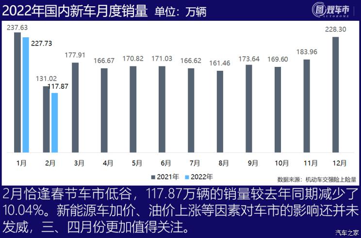 [本站 资讯] 根据机动车交通强制险上险量统计,2022年2月国内新车上险销量117.87万辆,较去年同期减少10.04%。2月恰逢春节,总量向来是年中低位,但10%的同比降幅有些反常,紧凑型轿车和紧凑型SUV这两个最大的消费基盘,分别出现了18.51%和16.36%的跌幅。