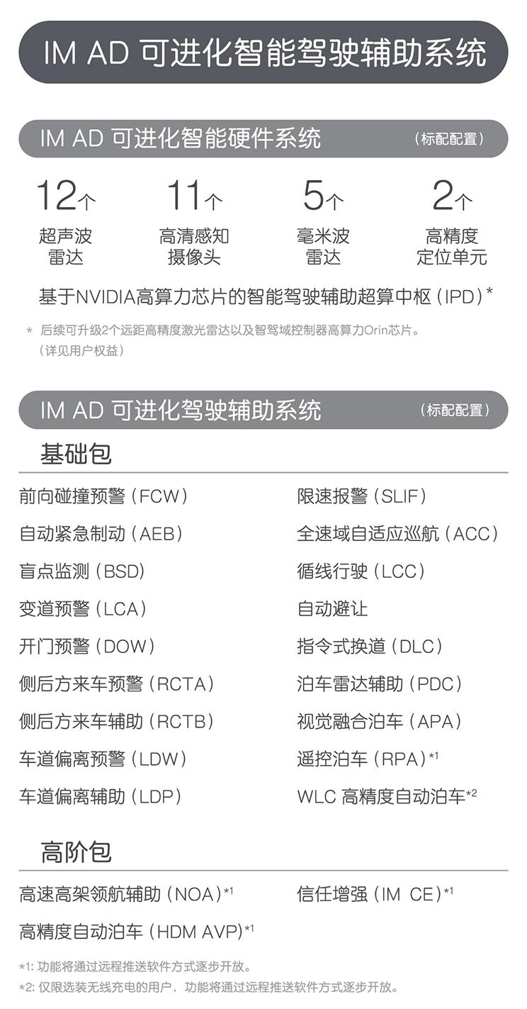 而在这套硬件加持下,会提供给新车包含前向碰撞预警、限速报警、自动紧急制动、全速域自适应巡航、盲点监测、循线行驶、编导预警、自动避让、开门预警、侧方预警、车道偏离预警等功能。而遥控泊车、高速高架领航辅助、高精度自动泊车等未来需要通过OTA逐步开放,算是期货了。