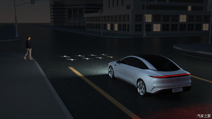 根据使用场景的不同,这套灯组可以显示或者在前方地面上投影不同的内容显示,除了常规的迎宾功能,还拥有行人礼让、导航辅助、变道辅助、示宽光毯、行人警示、前车距离提醒、电量显示等功能。