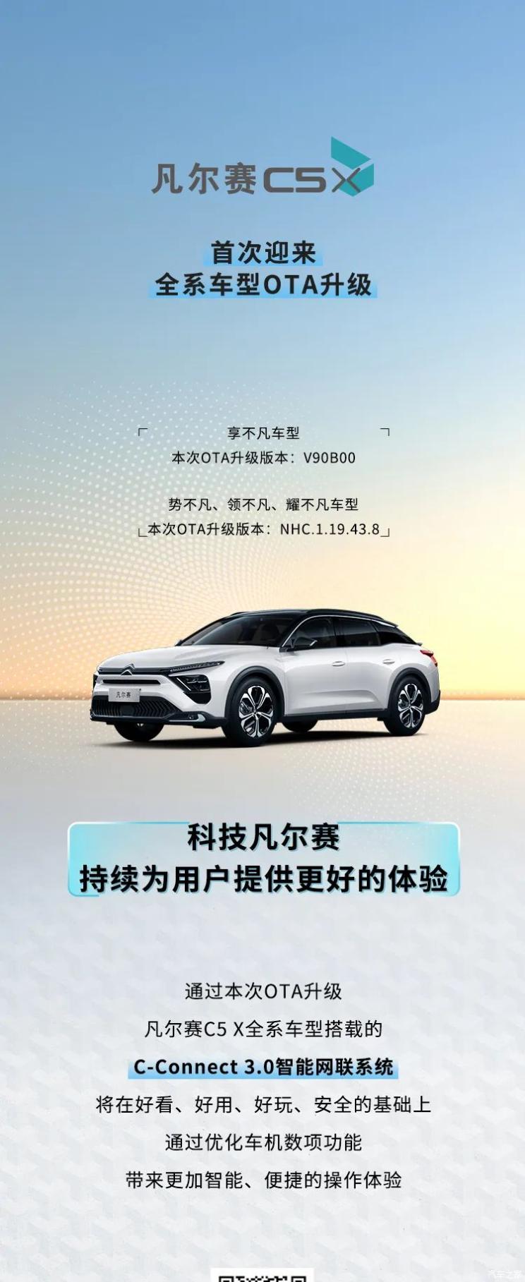 3月24日,我们从东风雪铁龙官方微信公众号处了解到,定位为中型车的凡尔赛C5 X从即日起首次迎来全系车型OTA升级。其中享不凡车型本次OTA升级版本为V90B00;势不凡、领不凡、耀不凡车型本次升级OTA升级版本为NHC.1.19.43.8。通过本次OTA升级,凡尔赛C5 X全系车型搭载的C-Connect 3.0智能网联系统将迎来优化车机数项功能,带来更便捷的操作体验,具体升级内容如下:
