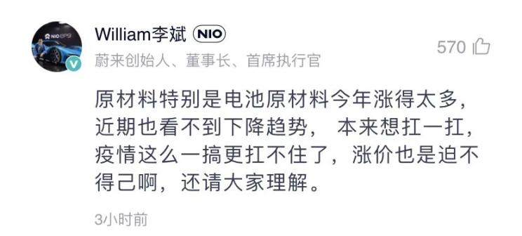 蔚来CEO李斌在该条消息下方评论表示:“原材料特别是电池原材料今年涨得太多,近期也看不到下降趋势,本来想扛一扛,疫情这么一搞更扛不住了,涨价也是迫不得己啊,还请大家理解。”