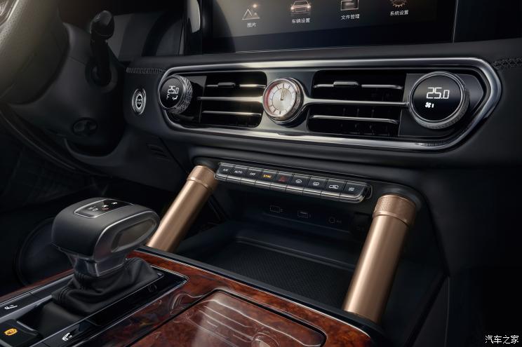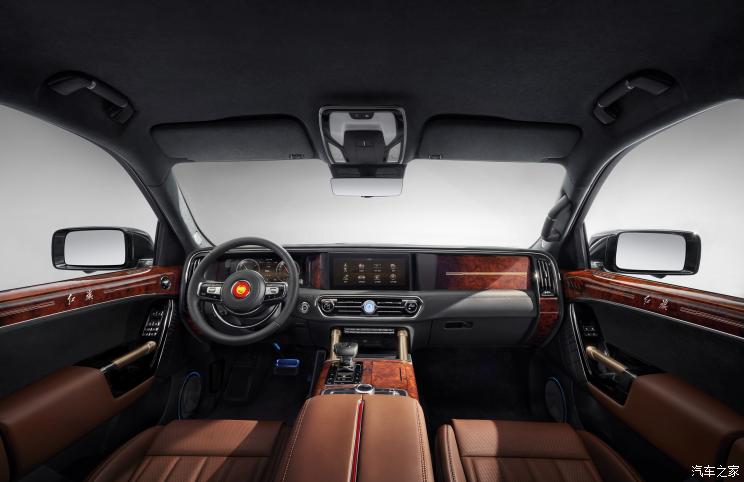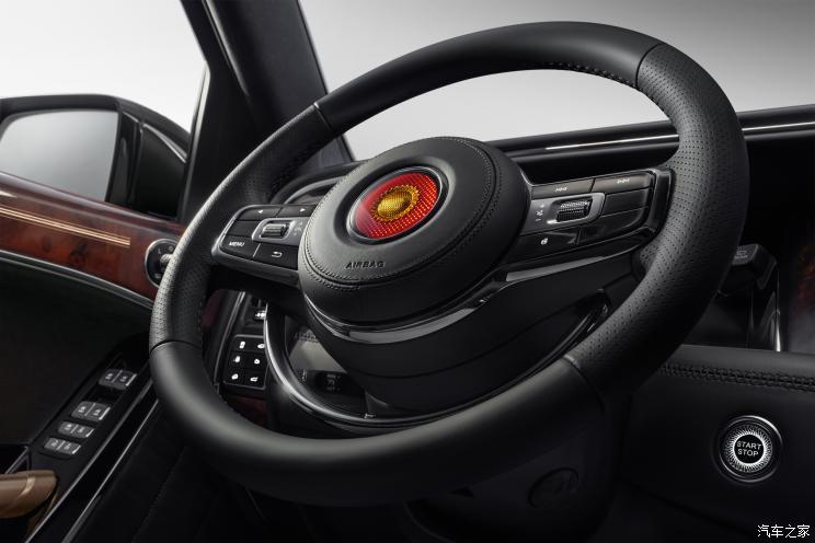 内饰方面,充斥着古典的尊贵,大量的木质饰板以及皮质包裹,并辅以金边装饰。方向盘融入了经典的复古设计,下部的镀铬装饰实际上是喇叭的控制开关。整个内饰横向宽度足够宽,两个座椅的间距足够远,中央是巨大的中央扶手。车门上部也包裹了的华丽的红木装饰,金色的门把手在阳光下格外耀眼。仪表盘和中控台还有两个巨大的屏幕。