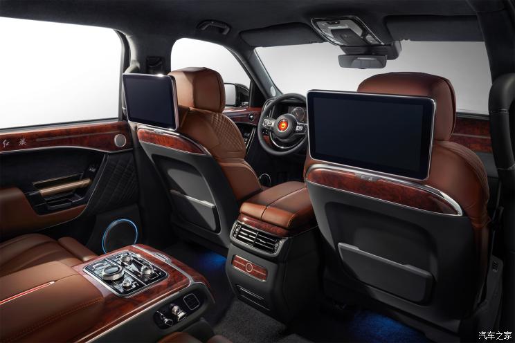 后排的车门同样如前门一样华丽,红木的装饰配合大面积的皮质包裹,以及金色的门把手。后排座椅两个独立的座位,带有腿托,并可以调整各种坐姿角度。两个座椅中央仍然是宽大的中央扶手,红木饰板上方,是多个控制车内功能的镀铬按键,在阳光下金光闪闪。