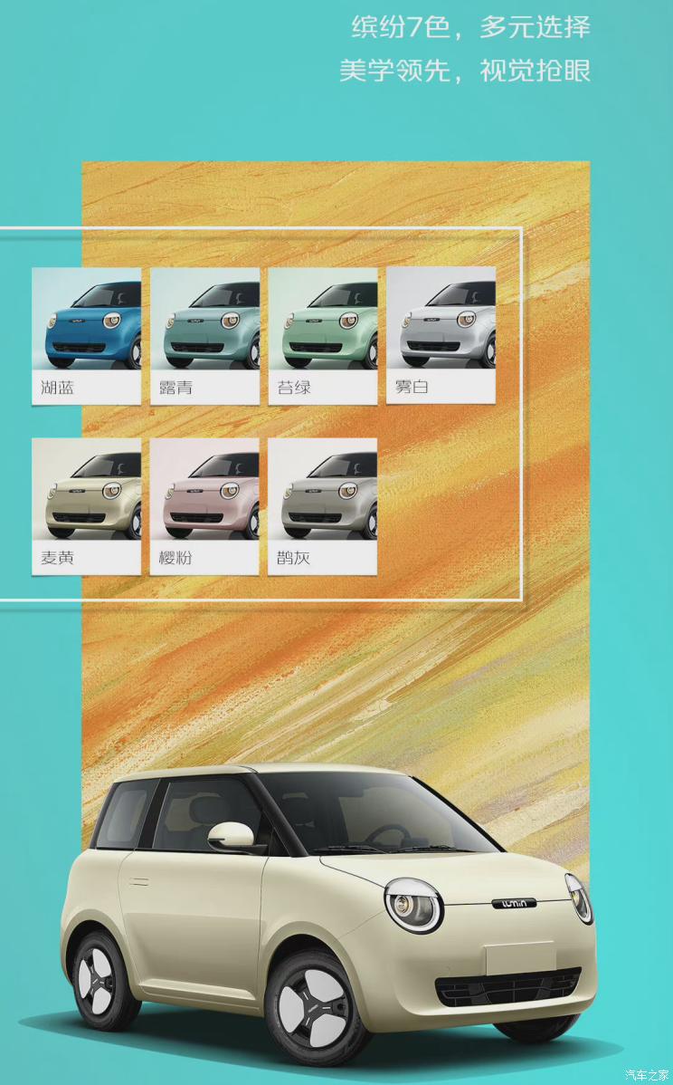 外观方面,新车整体圆润可爱,前大灯上方加入“蒙版”,让其看上去像极了一双bulingbuling的大眼睛,营造出可爱的视觉效果。同时,新车采用全新的“LUMIN”LOGO。在车型配色方面,新车提供雾白、苔绿、湖蓝、鹊灰、露青、麦黄、樱粉7种车身颜色可选,整体上走活泼青春路线。