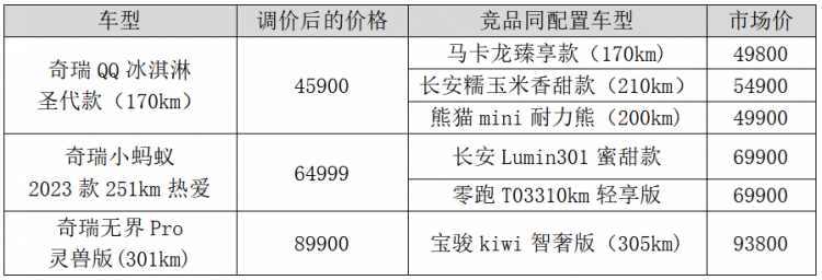 2023年3月27日0点起,奇瑞新能源旗下奇瑞QQ冰淇淋、奇瑞小蚂蚁和奇瑞无界Pro三款产品官方指导价正式回调,至高回调幅度9000元。当汽车行业最残酷的价格战打响,限时降价、保价等奇招尽出时,奇瑞新能源将格局直接拉满,成为纯电小车首家官降。