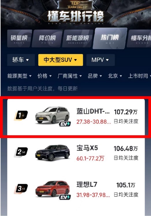 蓝山亮相以来,受到行业及用户的高度关注,上市后,全网热度更是一路攀升,连续霸榜多个专业平台,在懂车帝APP日均关注度高达107.29万,位居中大型SUV热门榜NO.1,成为家庭用户积极青睐的大六座SUV首选车型。