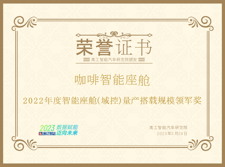 在2023年度(第五届)高工智能汽车市场峰会暨年度评选颁奖仪式上,基于2022年中国市场乘⽤车前装量产数据表现,长城汽车咖啡智能座舱(基于域控制器架构)以24.24万台套前装标配搭载量排名⾃主品牌市场占有率第⼀位。咖啡智能凭借先进的智能座舱技术能力、出色的用户反馈及优异的搭载量,获得了“2022年度智能座舱量产规模领军奖”。