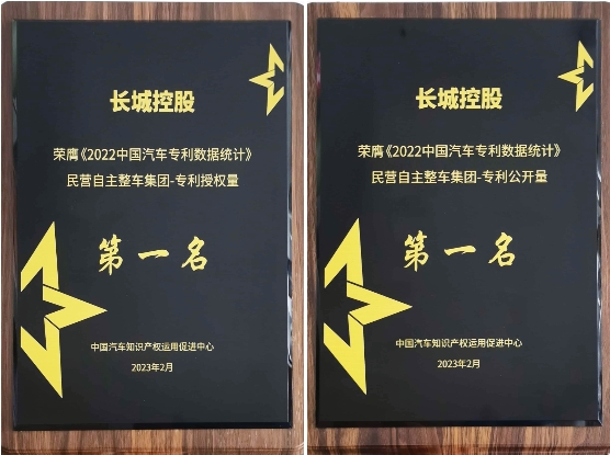 6月8日,中国汽车知识产权运用促进中心为长城控股(包括长城汽车、长城控股旗下零部件等子公司)授予《2022中国汽车专利数据统计》“民营自主整车集团-专利授权量第一名”“民营自主整车集团-专利公开量第一名”两项证书。
