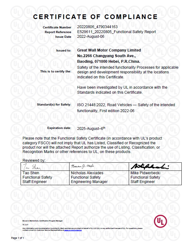 功能安全方面,长城汽车通过了德国TÜV莱茵ISO 26262功能安全管理认证,并获得ASIL D最高等级认证证书。网络安全层面,依据ISO/SAE 21434标准建立网络安全体系(CSMS),并获得UNR155车辆网络安全管理体系符合性证书,成为国内首家获得德国KBA颁发此项认证的公司,标志着长城汽车具备了国际领先水平的信息安全和隐私信息保护能力。SOTIF(预期功能安全)层面,咖啡智能新一代电子电气架构是国内率先符合最新预期功能安全标准ISO 21448体系的架构,覆盖道路环境、自动驾驶系统等方面,能有效地消除客户安全顾虑。