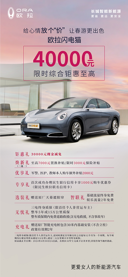 远方的暖风发来邀约,小长假也将陆续登场,怎能继续深宅在家?4月1日至30日,欧拉闪电猫释出终极版购车福利,官方指导价18.98万起,限时综合钜惠至高40000元,更有多重礼遇叠加,即可解锁一款专属于自己的“15万级精致主义实用轿跑”。心动的等等党们,是时候主动出击,抓紧这波钜惠福利,让欧拉闪电猫带着你,去开启都市逃离计划,尽情享受人间四月天!