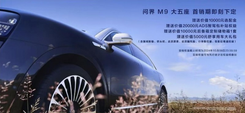 目前,下定问界M9大五座还可享受一系列优惠政策,包括价值10000元选配金及价值20000元ADS智驾包补贴权益,价值10000元后备箱定制储物箱1套和价值5000元舒享用车大礼包等。而且,9月24日-10月8日期间订购车辆,交付即享价值1800元充放电套装(问界系列车型同享)。
