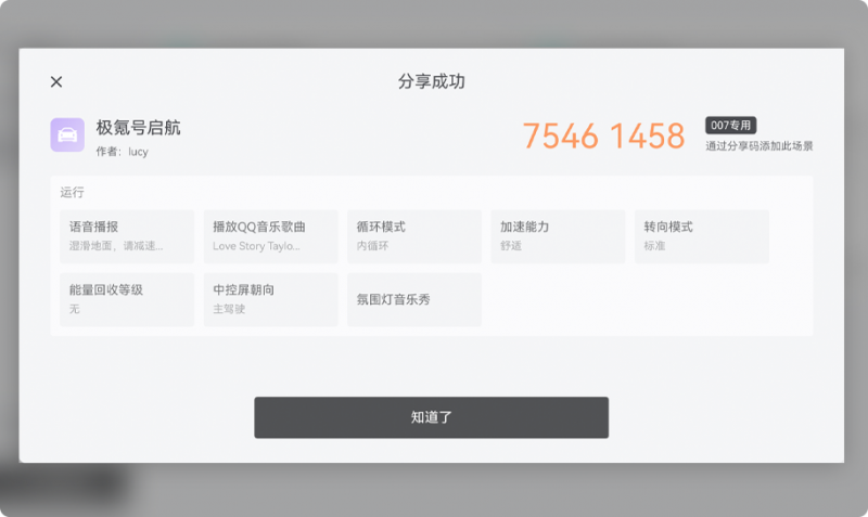 对于购车群体相对年轻的极氪007而言,持续为用户创造更潮流个性的智慧用车生活是不可或缺的一环。对此,极氪007 OS 6.2实现了场景工坊2.0的全新升级。其中包括:新增了场景工坊分享功能,用户可以将自定义场景生成分享码分享给他人,也可以基于他人的分享码快速创建自己的场景;优化了场景运行逻辑,新增了7项推荐场景;同时,还新增了“灵动贴”快捷触发场景工坊的自定义场景,一键触达个性化场景,提高操作便利性。