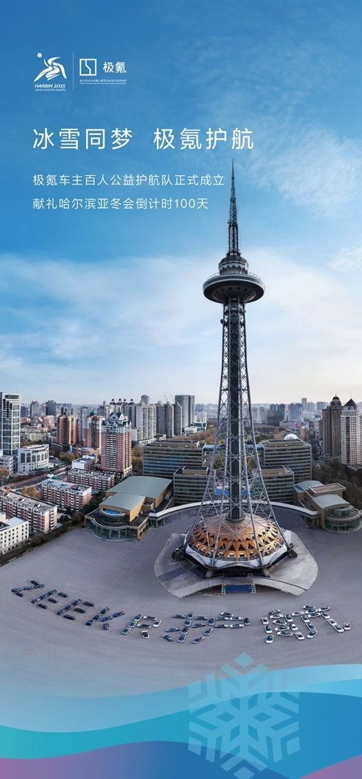 为献礼亚冬会倒计时 100 天,极氪车主百人公益护航队组成巡游车队打卡哈尔滨知名地标,并在龙塔下组成“ZEEKR 护航”车阵,彰显出极氪用户响应人文亚冬的公益精神。