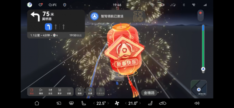 对于问界全系车型而言,新增的如意蛇纹、金蛇纳福等春节壁纸,营造出吉祥温馨的新年氛围。同时,新年限定版ADS App还新增新年主题,当用户激活NCA智驾领航功能时,贺新年灯笼和烟花特效会在ADS 3D视图以彩蛋的形式出现,还有更“福气”的智驾状态岛、会放烟花的远山天际线等待探索。
