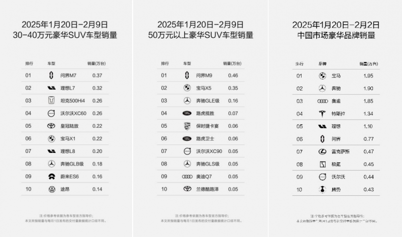 2025年1月20日-2月9日,问界又取得了双车登顶销量榜的好成绩,其中问界M7实力领跑30-40万元豪华SUV,问界M9赢得50万元以上豪华SUV车型销量榜首。问界品牌位列中国市场豪华品牌销量第六名。