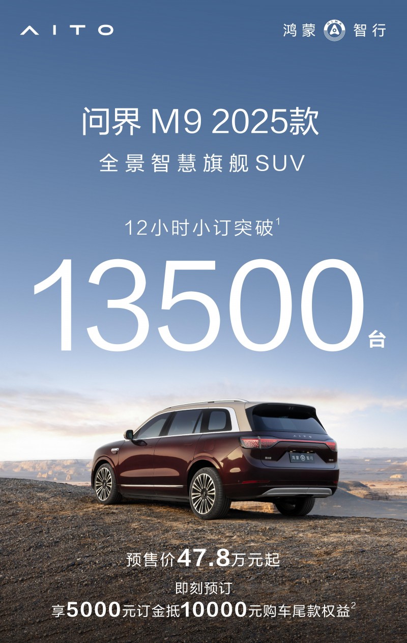 3月6日,全景智慧旗舰SUV问界M9 2025款正式开启预订,预售价47.8万元起,并计划于3月上市。数据显示,仅12小时小订即突破13500台,充分展现问界M9在高端豪华市场的强大号召力。