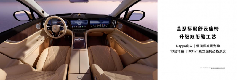 座舱方面,新车提供大五座和享六座两种方案,全系标配舒云座椅,采用优质Nappa真皮,为用户打造百变奢享空间。其中,大五座二排可选奢享零重力座椅套装,新增物理按键,支持一键即享;享六座主驾二排座椅升级电动腿托,坐拥奢适舒享体验。