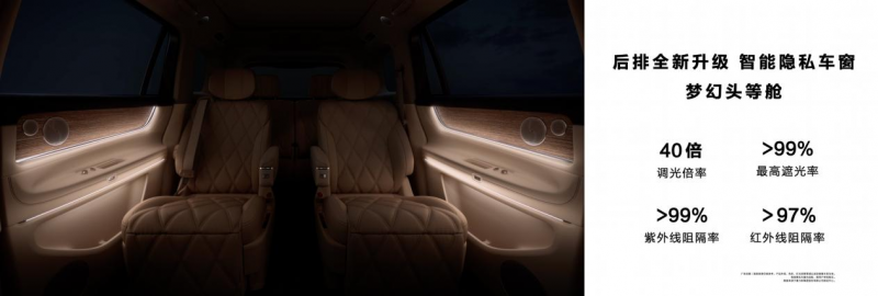 针对夜间出行安全,新车新增智能动态光毯,并升级华为临境抬头显示系统,用科技照亮安全之路。此外,新增智能隐私车窗选配方案,可通过智能调光随心掌控明暗,既能看得见风景,也能守得住隐私,为用户带来更沉浸的休憩空间。
