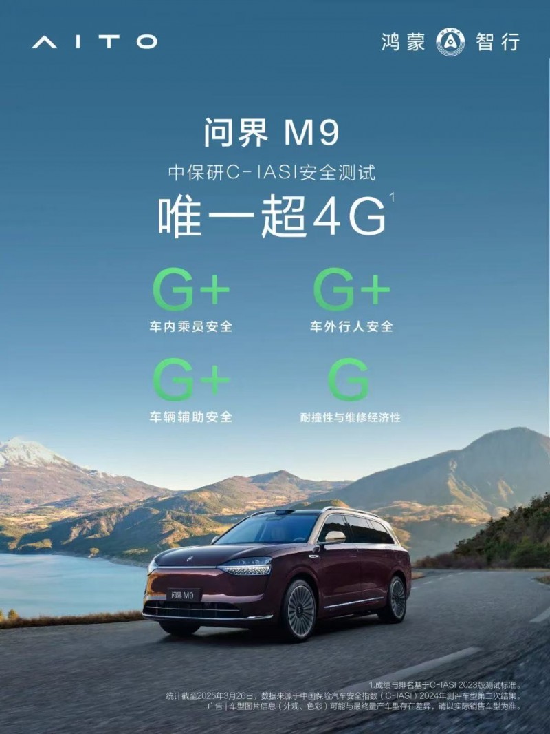 在3月20日公布的中国保险汽车安全指数(以下简称“C-IASI”)评测结果中,问界M9凭借其卓越的安全性能,荣获G+/G+/G+/G超安全评级,成为历史参评车型中唯一获得G+/G+/G+/G最高等级的车型。