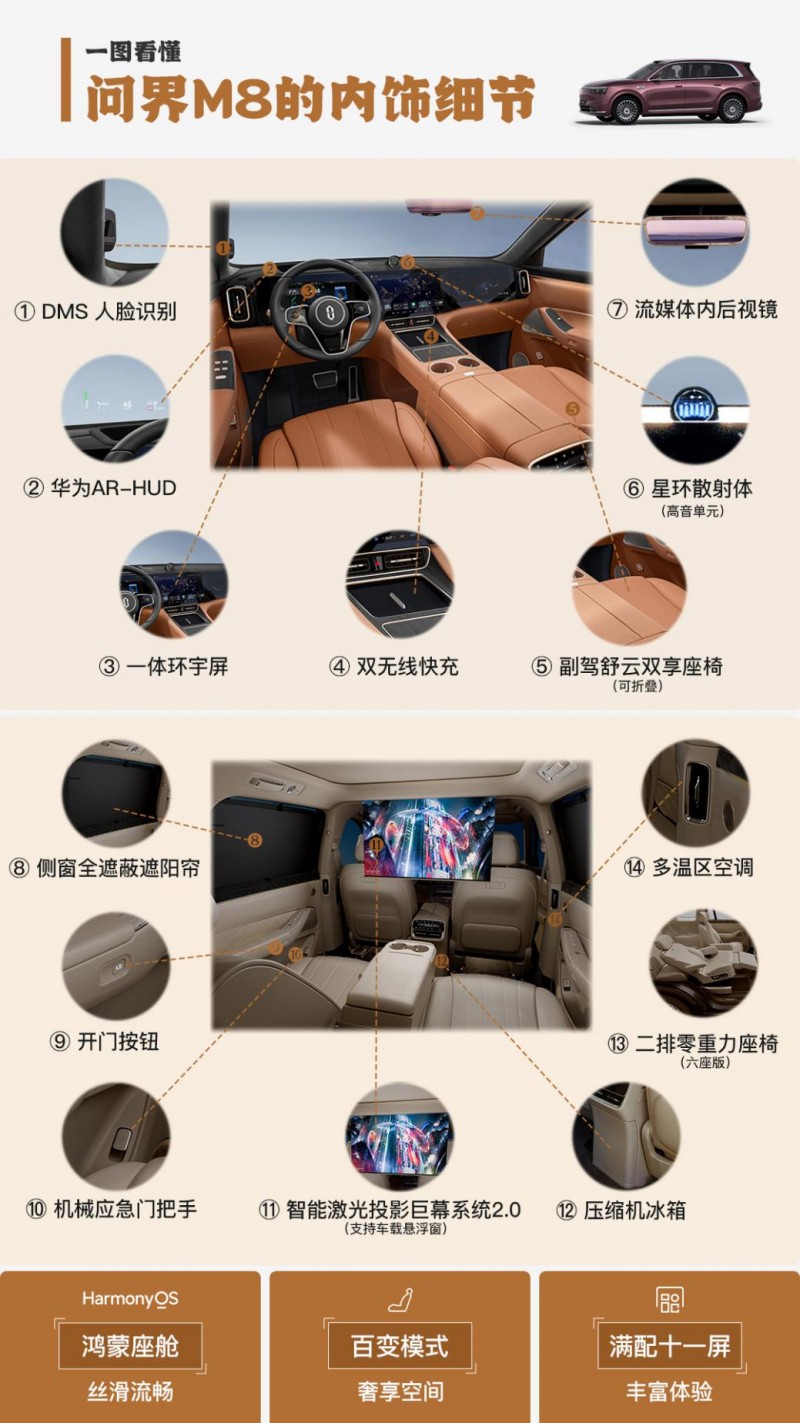 此次,问界M8的家族化设计语言获得了官方诠释,它的内外设计延续了“极致、纯净、简约”的美学原则,外观采用了全新麒麟踏海设计语言,并延续家族的鲲鹏之志元素。内饰采用双环抱式座舱设计,极致对称的美学融合高品质材质与独特工艺,共同营造出车内的科技豪华氛围。内外合一,凸显智慧美学。