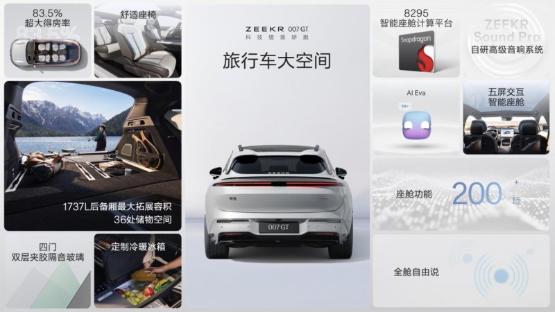 旅行车大空间:83.5%超大得房率,灵活拓展同级独有,座椅舒适、音响视听、智能化体验全部拉满,极氪007GT让用户满载热爱即刻出发。