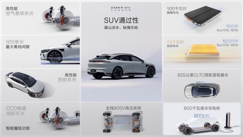 SUV通过性:同级最优底盘能力、行业最强三电系统、领先超快充补能体系,极氪007GT拥有通过、脱困、穿越三大技术能力,陪伴用户奔赴山海,探索未知和远方。