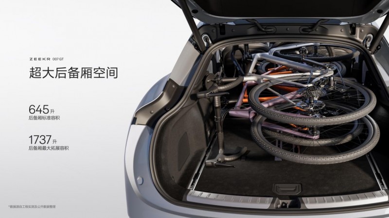 极氪猎装更能装。得益于浩瀚原生纯电架构L113最优布局,极氪007GT拥有2925毫米超长轴距,83.5%超大得房率,车内纵向有效空间接近2.5米,同级最大。后排腿部空间超越同级轿车和旅行车,头部空间也很充裕。645升后备厢容积超过80%同级SUV,后排座椅放倒后可拓展至1737升,轻松容纳3辆公路自行车。
