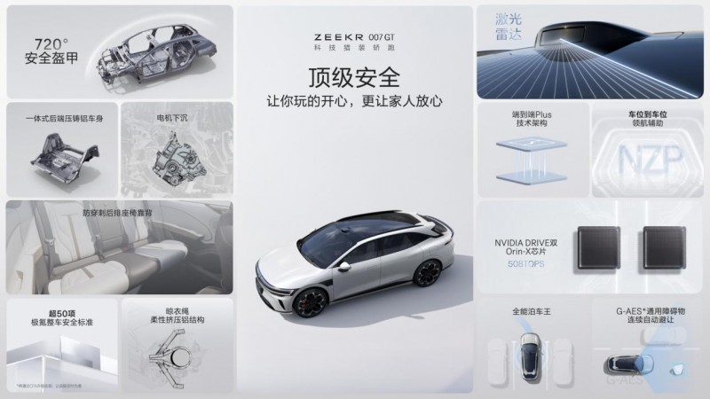 顶级安全:极氪007GT是「公路坦氪」家族新成员,拥有行业首创“电机下沉”黑科技,全系标配极氪千里浩瀚智驾H7方案,全系标配激光雷达,首搭G-AES连续避让功能、AVP代客泊车辅助功能、机械车位离车泊入功能等,提供主被动全方位安全守护。