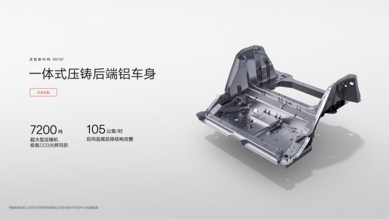极氪不满足于应试安全,面对实际驾乘中有风险的工况,法规没要求,极氪有要求。以前向碰撞为例,极氪007GT通过50千米/小时正面中心柱碰测试,比业界标准严苛一倍以上。在后向碰撞上,极氪007GT标配一体式压铸后端铝车身,极大提升了追尾碰撞的安全性。被动安全方面,极氪007GT以50+项极氪安全标准打造720°安全盔甲,为驾乘人员提供全方位安全保护。